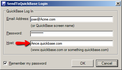 - On the SendToQuickBase Login dialog, change the "Host" URL from www.quickbase.com to YourCompanyName.quickbase.com where